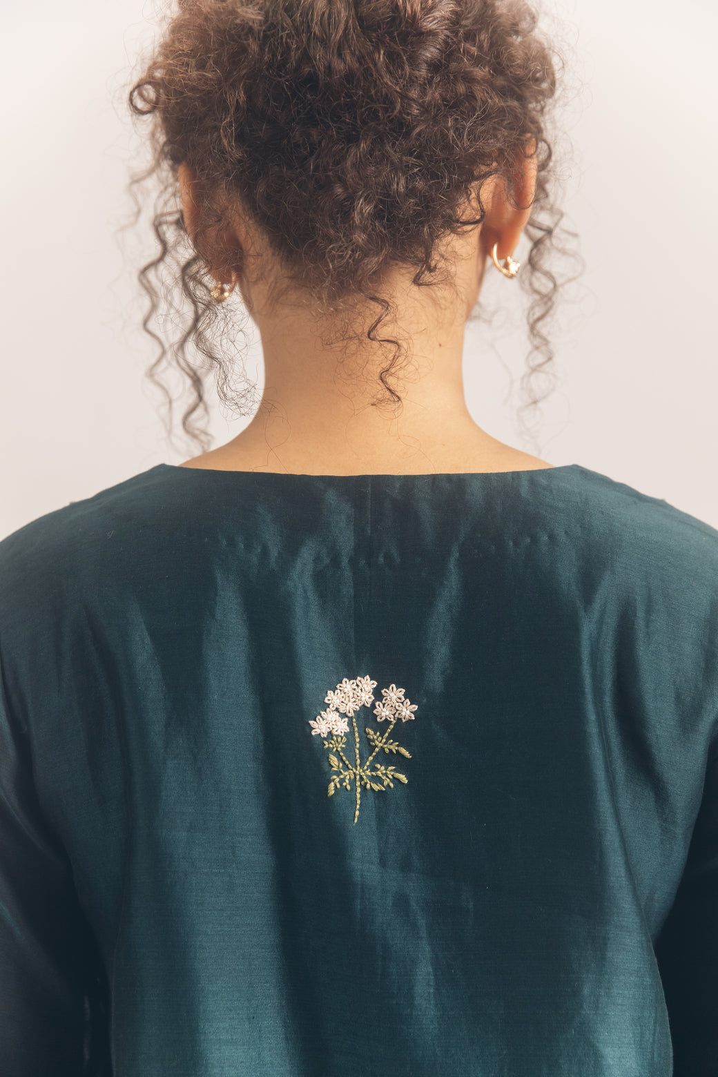 Details : Fit and flare top with flared sleeves, embroidered motif at back and gathered skirt