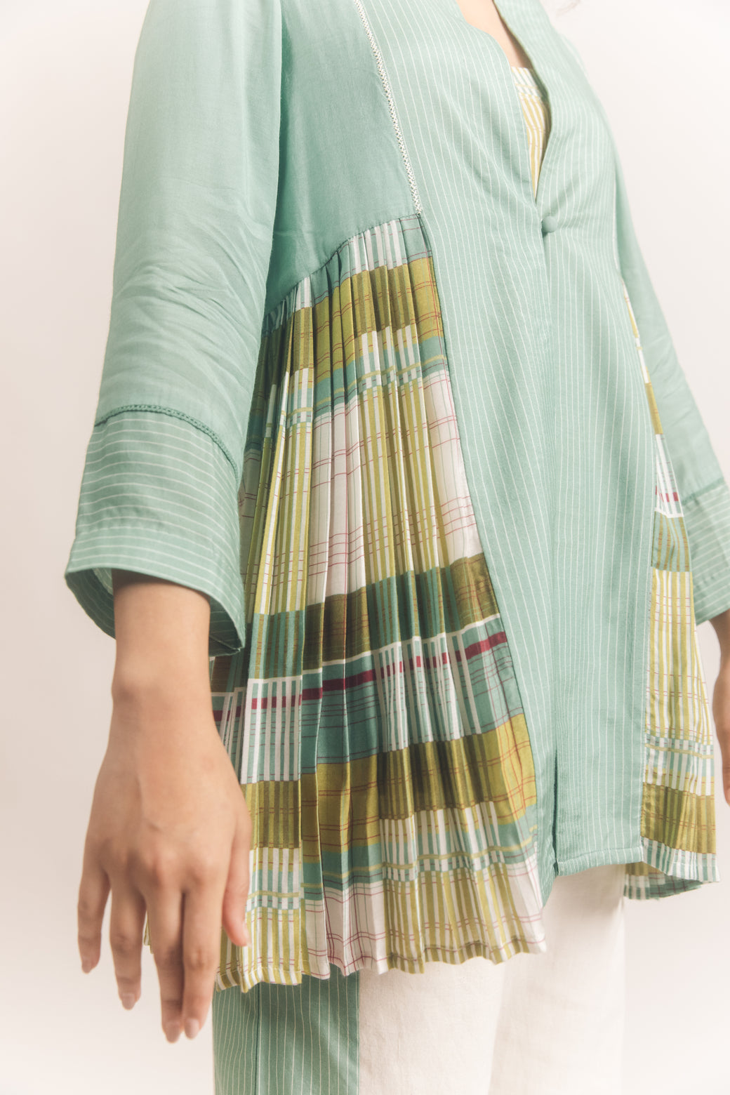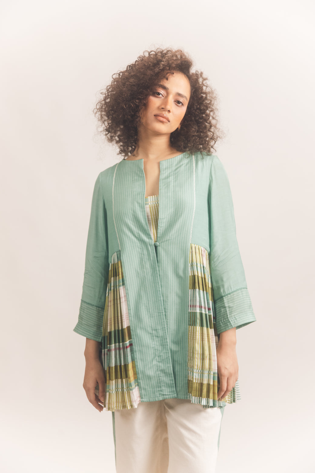 Details : Paneled pleated open front jacket with a loop button