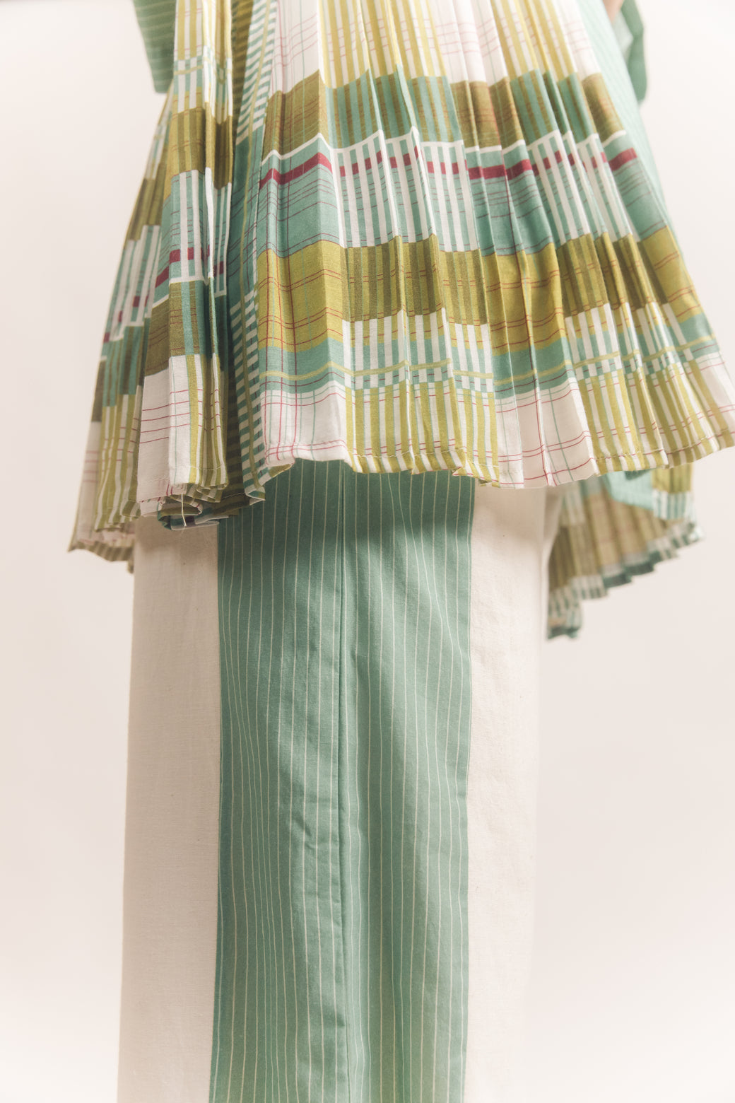 The Elsa Jacket is a soft paneled jacket with pleats going round from the sides to the back. The pleats are in our beautiful checks with striped panels at the front. It has a loop button in the front and embroidered cross stitch lines throughout.