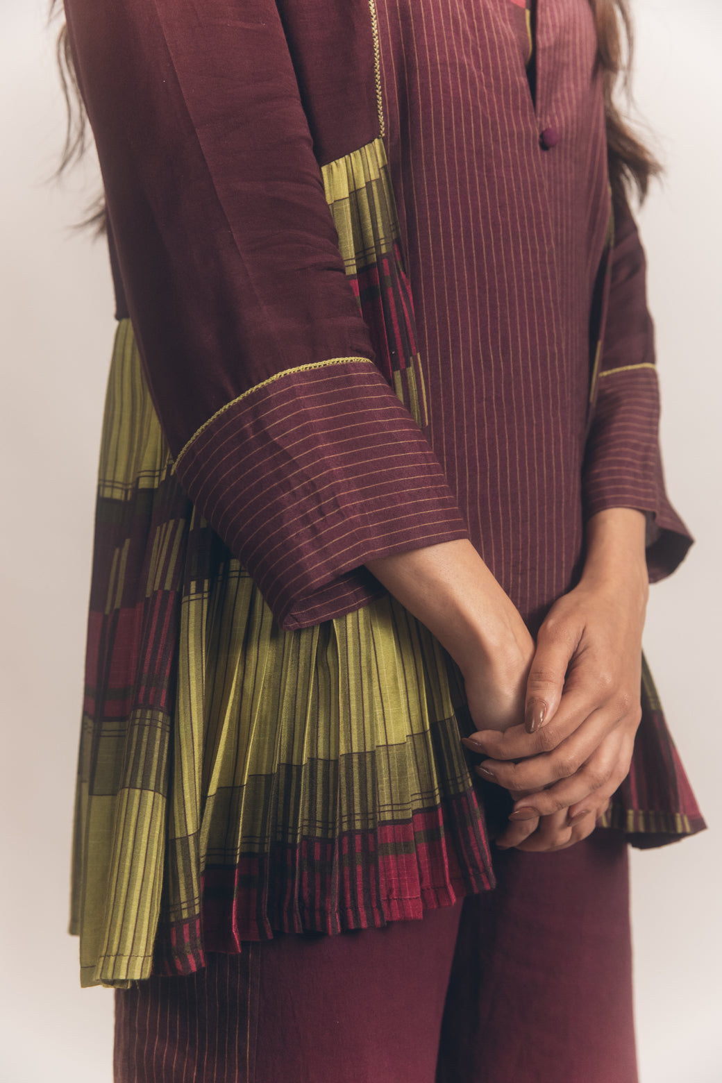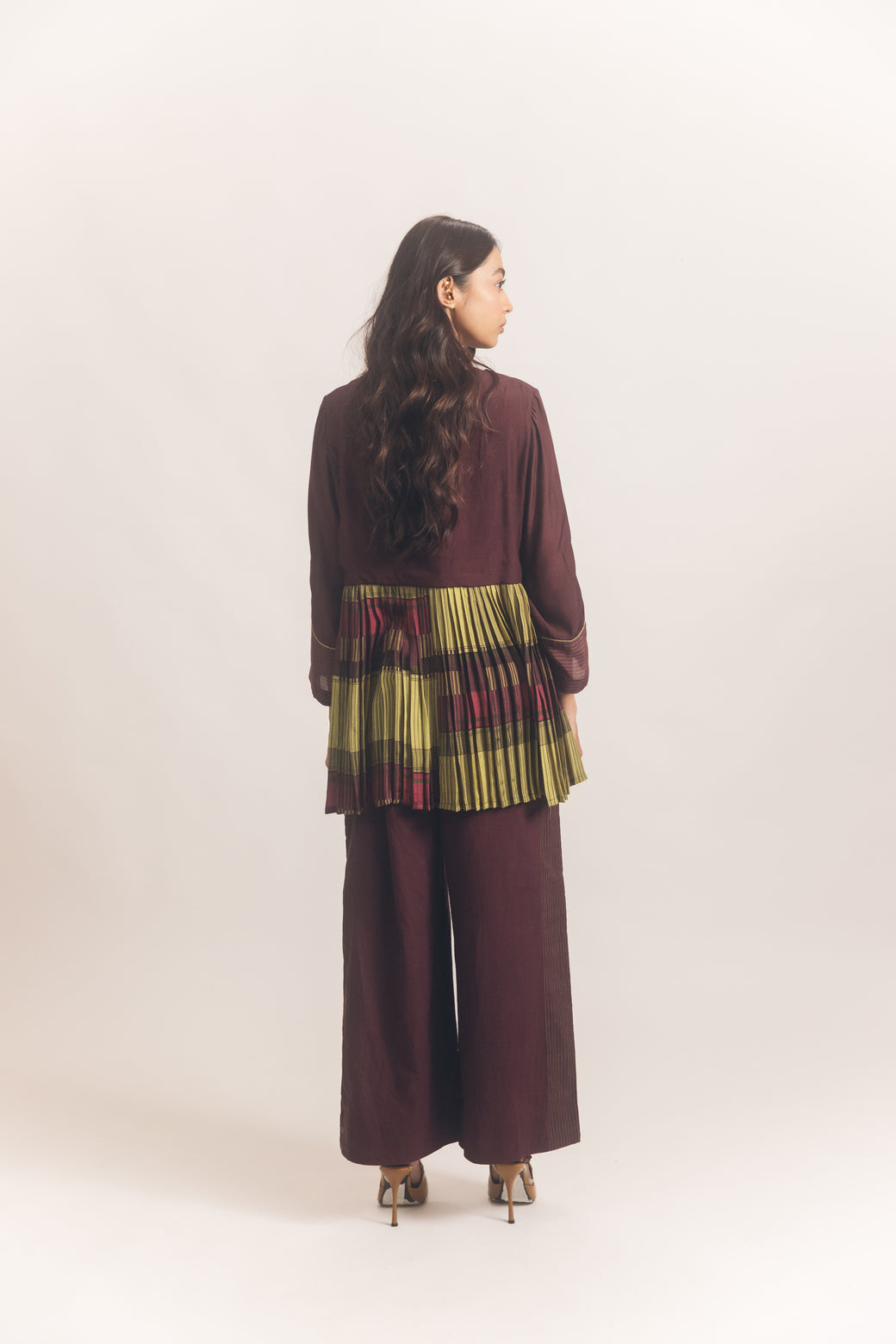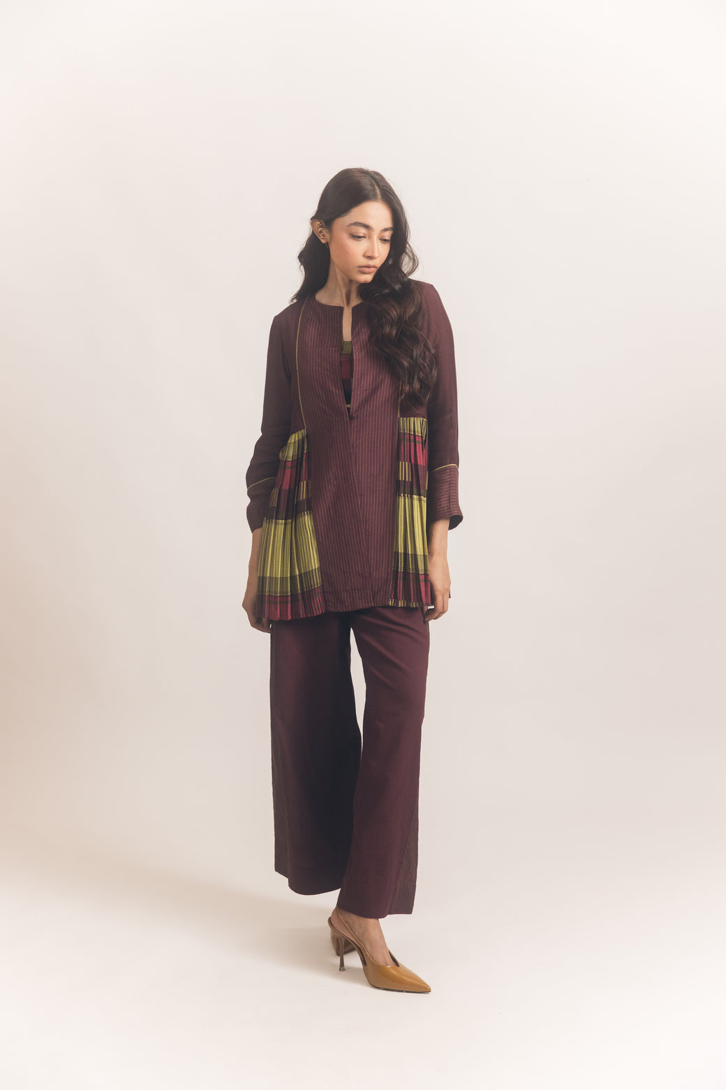The Elsa Jacket is a soft paneled jacket with pleats going round from the sides to the back. The pleats are in our beautiful checks with striped panels at the front. It has a loop button in the front and embroidered cross stitch lines throughout. It is paired with our flared straight pants with striped panels at the sides and is an essential for your wardrobe. A breezy silhouette, these pants are made of pure cotton and come with an elasticated waistband adding to the set’s comfort.