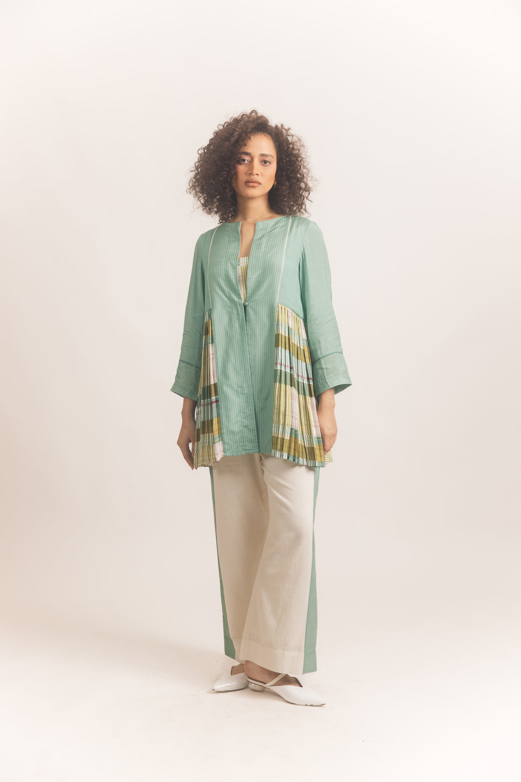 Details : Paneled pleated open front jacket with a loop button, striped straight pants with pockets and printed slip