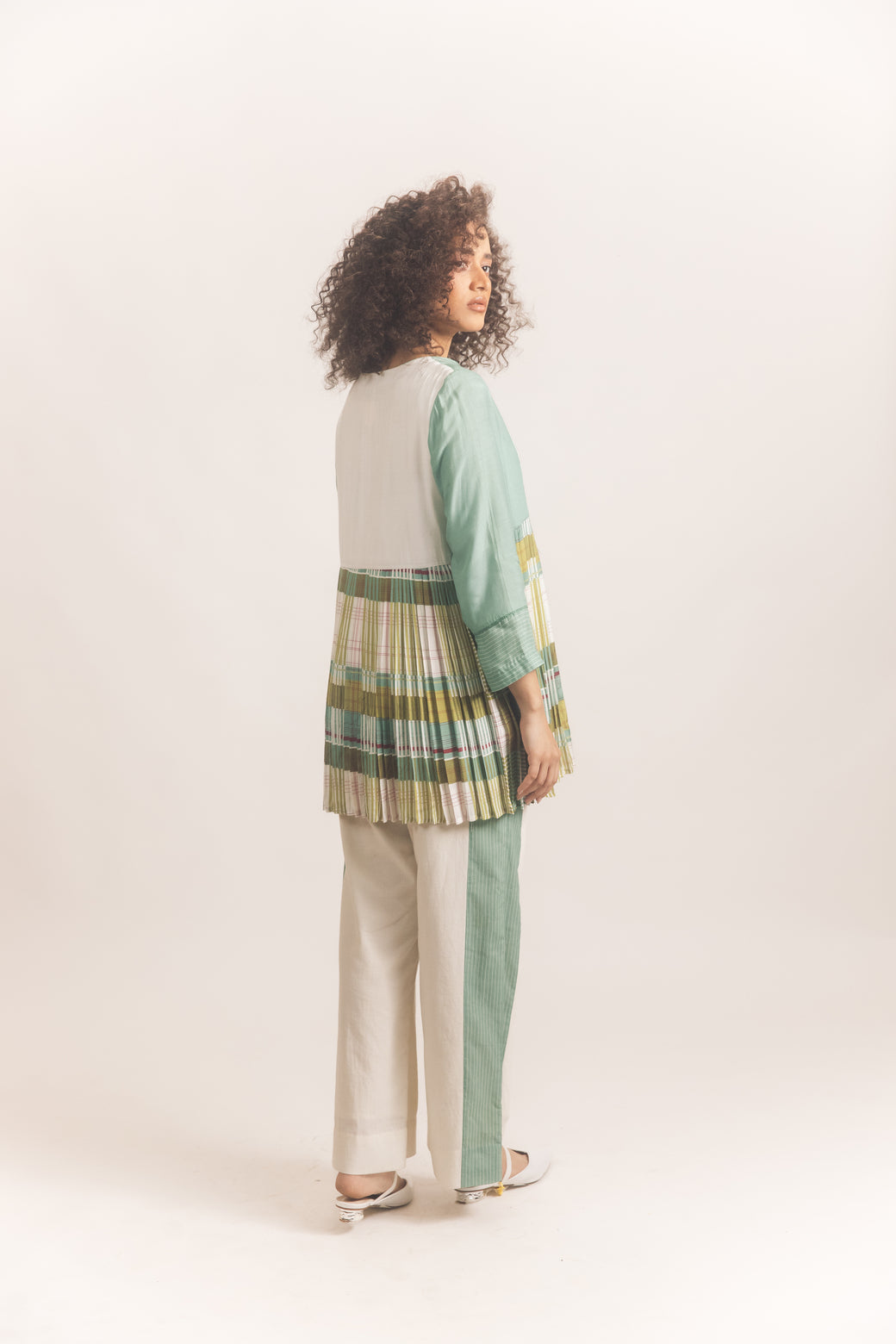 The Elsa Jacket is a soft paneled jacket with pleats going round from the sides to the back. The pleats are in our beautiful checks with striped panels at the front. It has a loop button in the front and embroidered cross stitch lines throughout. It is paired with our flared straight pants with striped panels at the sides and is an essential for your wardrobe. A breezy silhouette, these pants are made of pure cotton and come with an elasticated waistband adding to the set’s comfort.