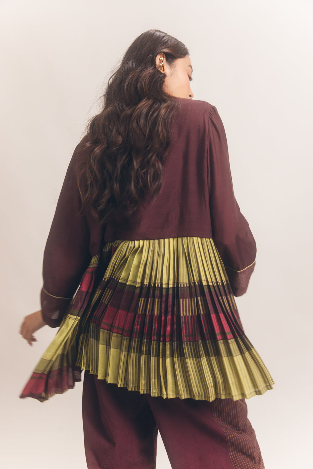 Details : Paneled pleated open front jacket with a loop button